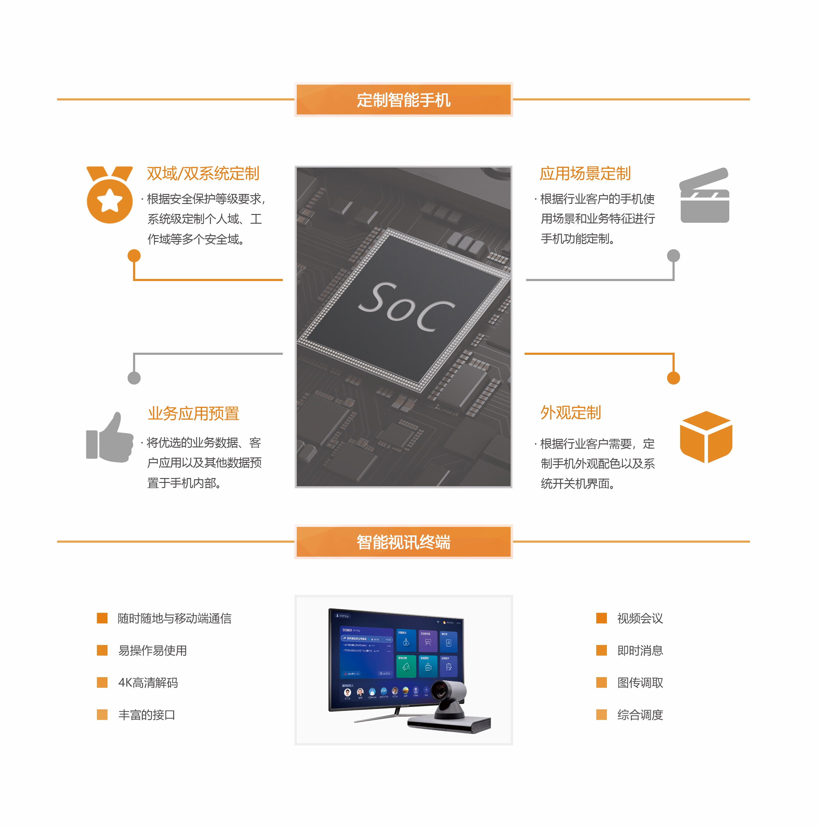 為了方便客戶提高移動手機的易用性、安全性和數(shù)據(jù)業(yè)務(wù)使用的方便性,我公司提供定制智能手機服務(wù)。同時,為滿足行業(yè)客戶在指揮中心、固定會議室的視頻會議、指揮調(diào)度等需求,我司提供智能視訊終端的定制化開發(fā)服務(wù)。