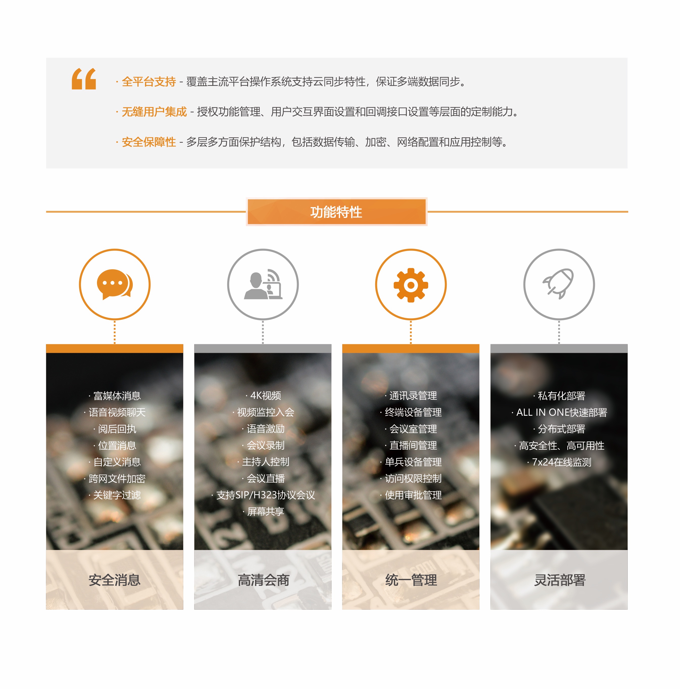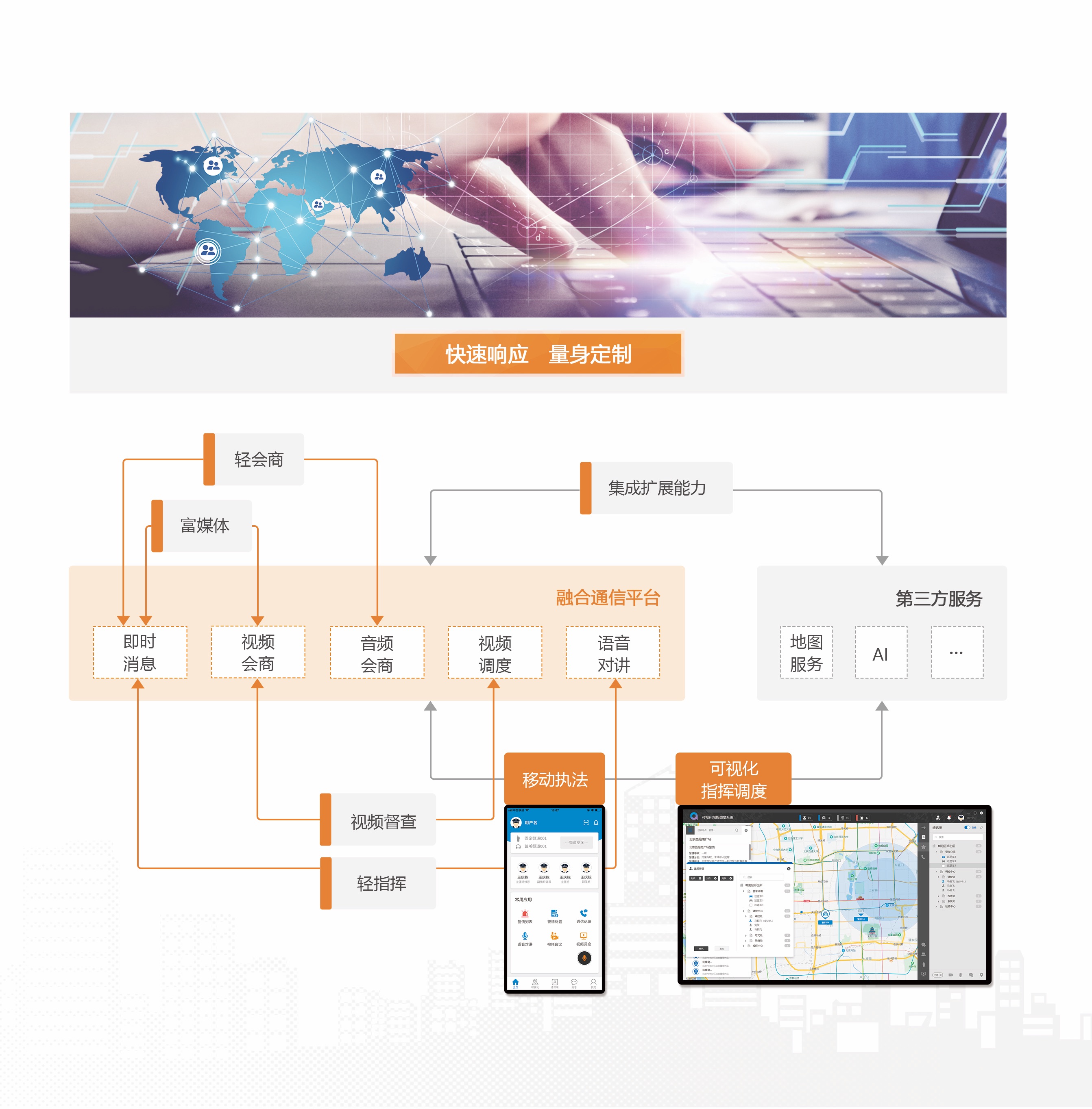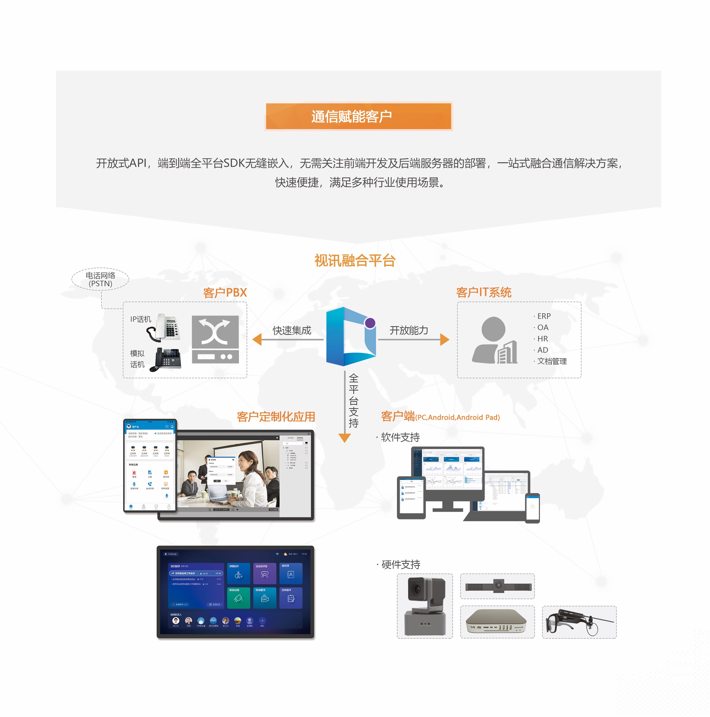 視訊融合平臺采用云架構(gòu)設(shè)計理念,使用多種核心技術(shù)優(yōu)化移動網(wǎng)絡(luò)下音視頻傳輸,保障用戶在波動的網(wǎng)絡(luò)環(huán)境下也能達到最佳的音視頻交互體驗。平臺支持視頻會議、即時消息、監(jiān)控調(diào)度、視頻圖傳、可視化地圖等多種功能,提升了用戶協(xié)作;支持桌面終端、移動終端、智能視訊終端等多種類型終端接入,保障用戶任意時間、任意地點、任意方式,都可以享受到高品質(zhì)的通信服務(wù)。 平臺具備超大容量、多形態(tài)部署、多種通信模式、靈活權(quán)限控制、統(tǒng)一通訊錄集成等特性,同時還通過開放式接口,提供強大的用戶定制功能,滿足多種行業(yè)使用場景。